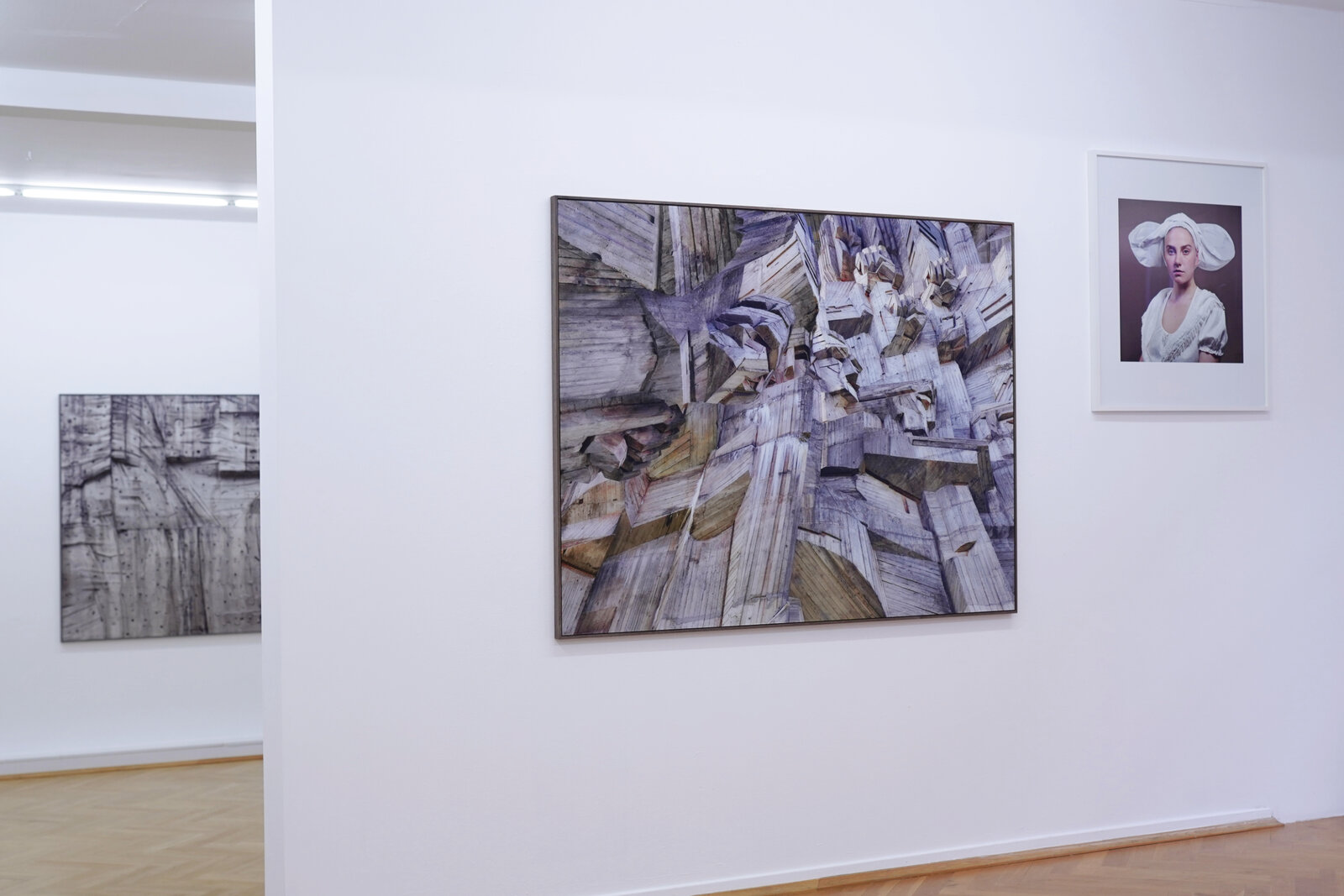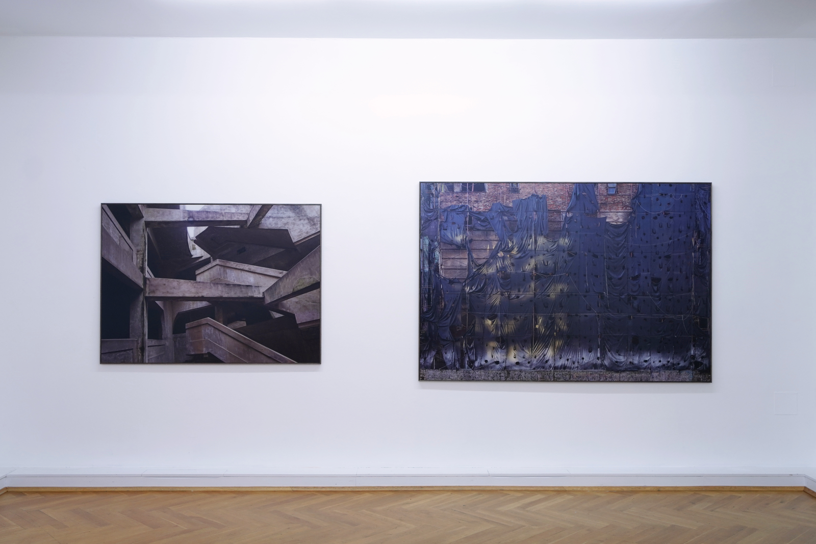 Die Assoziationsgeflechte, die rund um die Arbeiten von Bernhard Prinz entstehen, sind eng mit den Werktiteln verwoben. MUT UND WILLE, LAMENTO oder BURKA sind Setzungen des Künstlers, anhand derer die in den Fotografien festgehaltenen Strukturen um eine Bedeutungsebene erweitert werden. Anstatt jedoch als simple Erklärungen zu dienen, liegt es an den Betrachter*innen, diese sprachlichen Komponenten als Angebote zum Dialog mit der jeweiligen Arbeit aufzunehmen und weiterzuführen. Dies trifft auch auf die beiden Porträts ÄON und OHNE TITEL (ABWÄGUNG) zu. Sie verweisen auf frühere Porträtserien von Prinz, in denen der Blick der Dargestellten einen auf ähnliche Weise nicht mehr loslässt. Die hier festgehaltene Spannung zwischen Intimität und kalter Ablehnung, zwischen Authentizität und Attribution fasziniert über alle zeitlichen Grenzen hinweg.