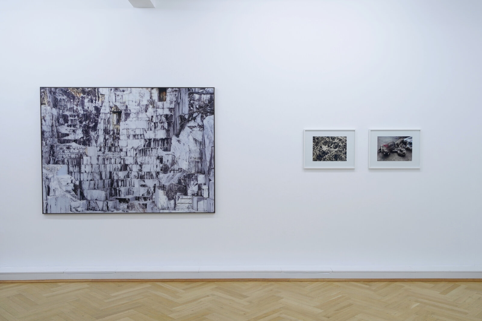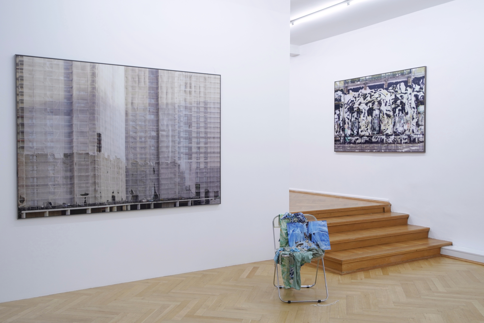 Horizontale und vertikale Linien durchziehen eine monumentale Wandoberfläche. Man erkennt unterschiedliche Arten von Adern - mal wölbt sich das Material durch sie nach außen, mal sind es Einkerbungen in sein Inneres, die auch als löchrige Ausformungen direkt ins Auge stechen. Diese ornamentalen Kompositionen resultieren einerseits aus dem Entstehungsprozess der einzelnen Betonelemente, aus denen sich die Kletterwand zusammensetzt, und andererseits aus ihrem Nutzungszweck. Offen bleibt, wo die Grenzen zwischen den Spuren menschlicher Aktivität und dem Naturgegebenen verlaufen. Vielmehr fließt in dieser Imitation der Natur beides zusammen, als Lebenslinien in der Materie, als Zeichen der Zeit. Je länger man die Arbeit BEYOND, Ausgangspunkt sowie Namensgeberin dieser Ausstellung, betrachtet, umso mehr Fragen tauchen auf. Was ist eigentlich dargestellt? Wo und wie ist es entstanden? Und sieht man hier überhaupt das Abbild von etwas real Existierendem oder handelt es sich um Fiktion?