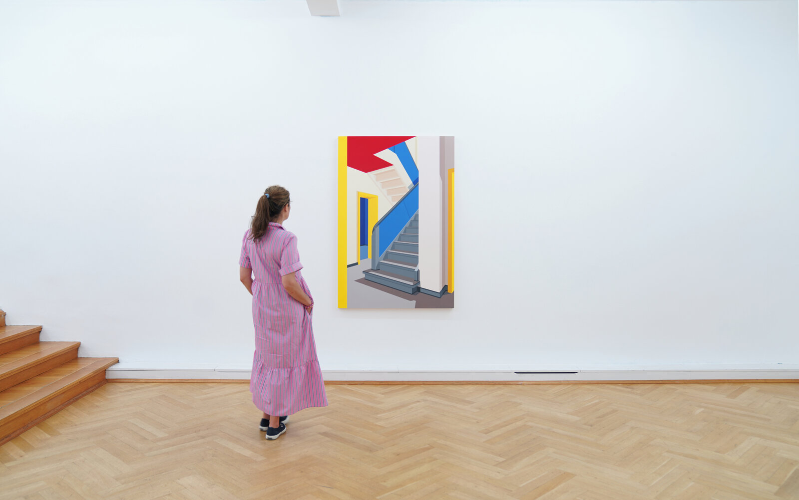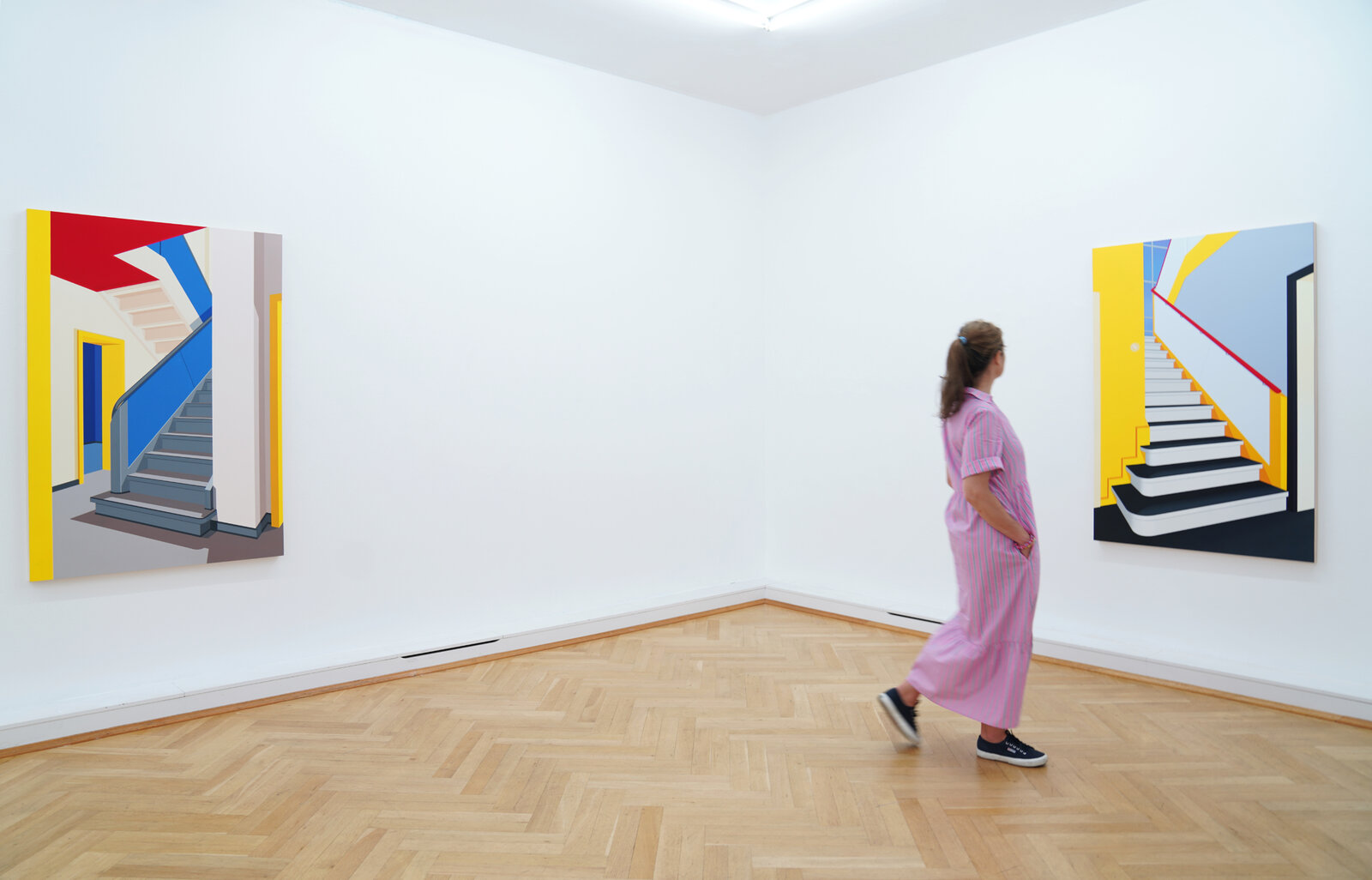 In den Arbeiten zu der aktuellen Ausstellung Passagen öffnet Rich den Blick auf menschenleere Innenräume. Diese Interieurs, inspiriert von historischen Vorbildern wie Oskar Schlemmers Bauhaus Stairway oder literarischen Bezügen zu Hans Fallada, laden die Betrachtenden ein, sich selbst in die Szene hineinzudenken: als Beobachter, als Gast, als Voyeur. Die Leere der Räume erzeugt eine beklemmende Stille – sie verweist auf das, was war, und das, was kommen könnte. Gerade im Fehlen des Menschen wird die Architektur zum Spiegel gesellschaftlicher Zustände, zur Bühne für das Unsichtbare.