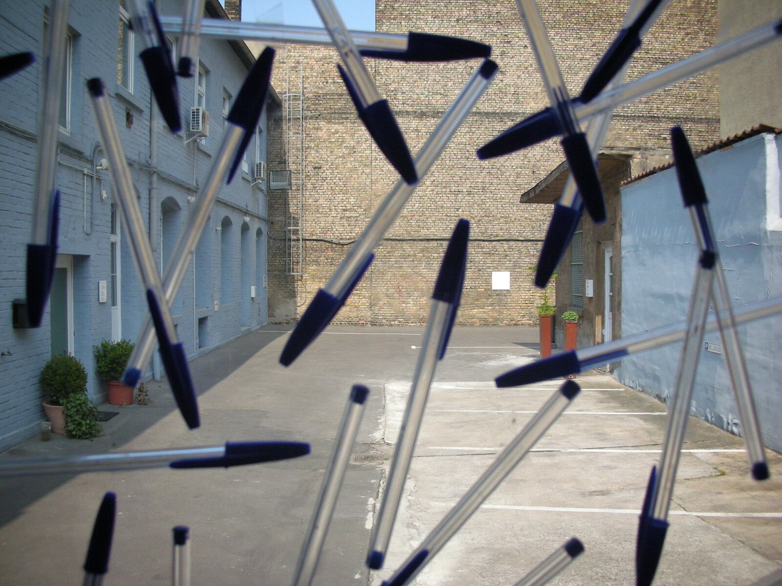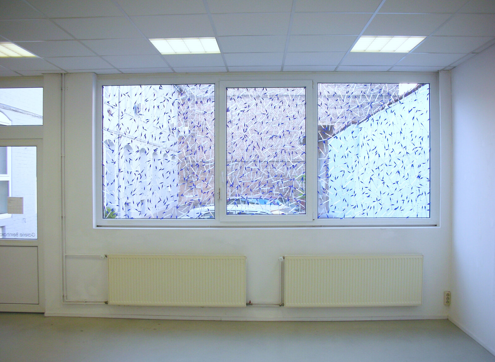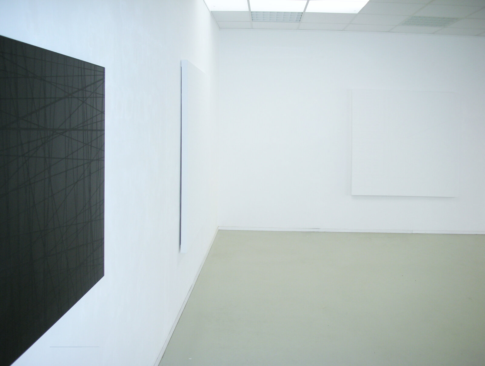 Herbert Hintereggers vier Bilder erschließen sich nicht leicht. Sie fordern Konzentration ein, genaue Betrachtung. Reliefartig, präzis, und für das Auge herausfordernd ziehen sich bei den drei weißen Gemälden Linien über das Bild, jedoch nicht ganz bis zum Rand. Ein Rand des weiß grundierten Bildes wie auch der Raum zwischen den Linien lässt die Leinwandstruktur erkennen. Dem Betrachter wird das Gegenständliche der Bilder deutlich, gerade auch durch die Hervorhebung der Linien, die auch in derselben weißen Grundierfarbe ausgeführt sind und denen nichts Gestisches anhaftet. Nun sind Reliefs meist aus festen Materialien hergestellt, Herbert Hinteregger bezieht sich mit Keilrahmen und Leinwand jedoch auf die Tradition der Malerei. Gerade dazwischen, zwischen Gemälde und Relief und der Benutzung von Grundierfarbe als Farbmittel stellt sich eine Spannung ein, die Fragen eröffnet. Die Titel, meistens bei Herbert Hinteregger „Untitled“, ein näherer Verweis nach einem Ort oder einer Landschaft jedoch in Klammern gesetzt dahinter, sind insofern in ihrer Bedeutung wieder relativiert. Sie geben einen Hintergrund für die Bildfindung des Künstlers an, die auch für den Betrachter einen Bezug herstellen, wenn auch chiffriert. Er verweist darauf, dass die Bildfindung erinnernden Charakter, Bezug nehmenden hat. Sie sind also nicht rein abstrakt, synthetisch, obwohl die Bilder auf den ersten Blick so erscheinen mögen. Es gibt zwischen den Linien Zwischenräume. Gehören diese konstituierend mit zum Bild? Ist das ein gemeinsamer Raum? Der des Betrachters und der des Künstlers zugleich? Die Zwischenräume könnten imaginär durch die Möglichkeit ihrer Fortführung im Raum noch weiter ausgreifen und die Linien durch Ihre Körperlichkeit, ihre reliefartige Hervorhebung weitergedacht noch zusätzlich Platz einnehmen. Ist das Bild fertig? Keine Farbe, die Nichtfarbe Weiß. Lichtschluckendes Weiß, kein Glanz. Vielleicht wäre es eine Lesart zu behaupten, Herbert Hinteregger kritisiert und behauptet sich vor einer geisttötenden Bilderflut durch Respekt vor sich und dem Betrachter, indem sich das Bild zwischen Betrachter und Künstler befindet, immer neu und immer wieder anders. Kunst als Kommunikator. Das Spiegelbild (Kugelschreibertinte mit einem Schwamm auf das Glas aufgetragen) verdeutlicht dies noch mehr. Auch der vorgefertigte Spiegel schafft Raum: Die Illusion des Betrachters im Spiegelbild und die Farbe dazwischen, als Konkretes. Farbe als Material, das künstlerische Medium schlechthin. Um nicht immer nur sich selbst im Bild wieder zusehen hat Herbert Hinteregger seine Kunst dazwischen gebracht.