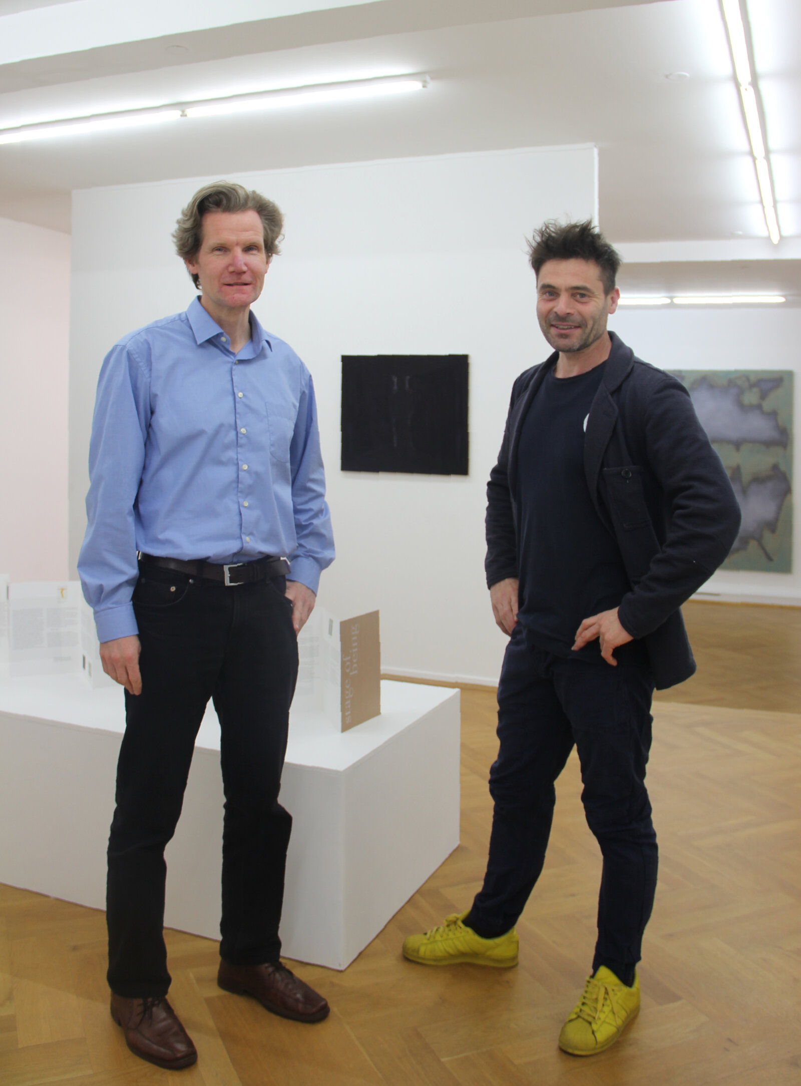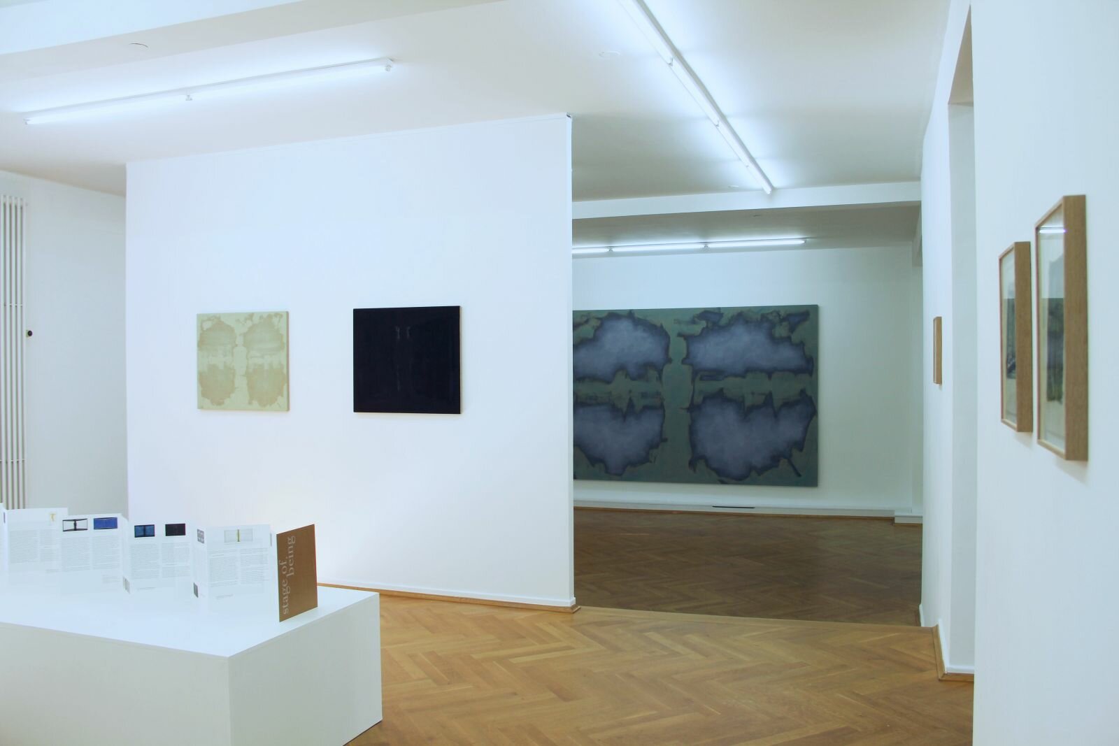 Ein kleines Gemälde aus dem Jahre 2014 fungierte als erster Impuls für die Stage of Being-Gemäldereihe. Trotz seines Formats von nur 30 x 40 cm weist es eine außerordentliche Präsenz auf. Die Komposition zeugt von Schlichtheit und Symmetrie. Ein breiter, leicht gebogener Schirm hebt sich strahlend gelb von dem dunkelvioletten Hintergrund des umgebenden Raumes ab. In der Mitte teilt eine diffuse Form in demselben Violett den Schirm in zwei Teile. Eine Öffnung war meine erste Assoziation, welche aber schon eine Sekunde später der von Konturen einer menschlichen Figur vor einem Bildschirm wich. Abhängig von der Art und Weise, wie meine Augen das Wahrgenommene gerade umsetzten, vermochte die Silhouetten ähnliche Figur ab- oder anwesend zu sein und wandelte sich vom Hintergrund in den Vordergrund, von Raum in Materie.