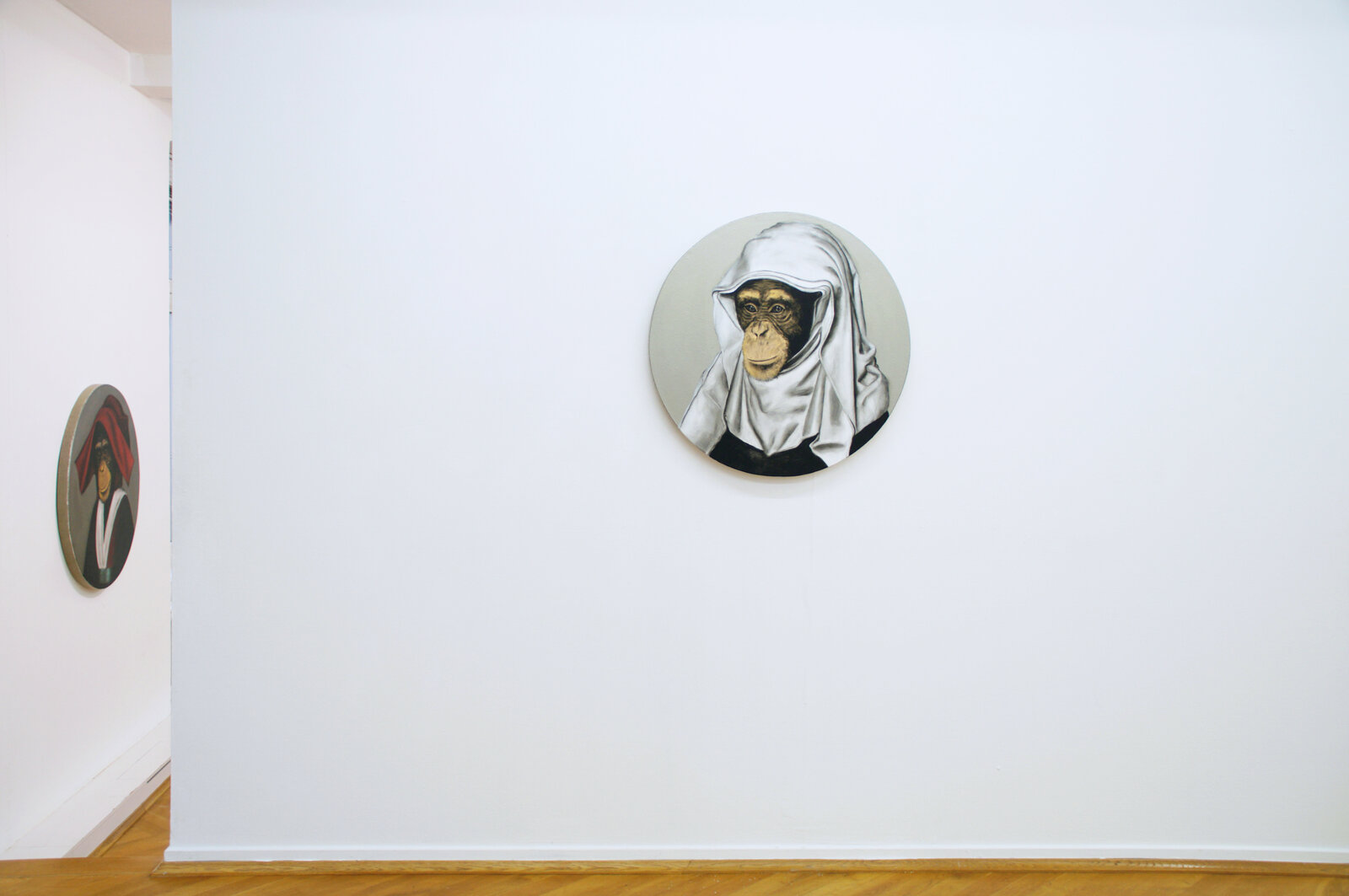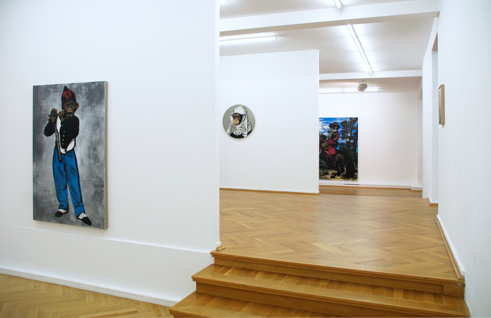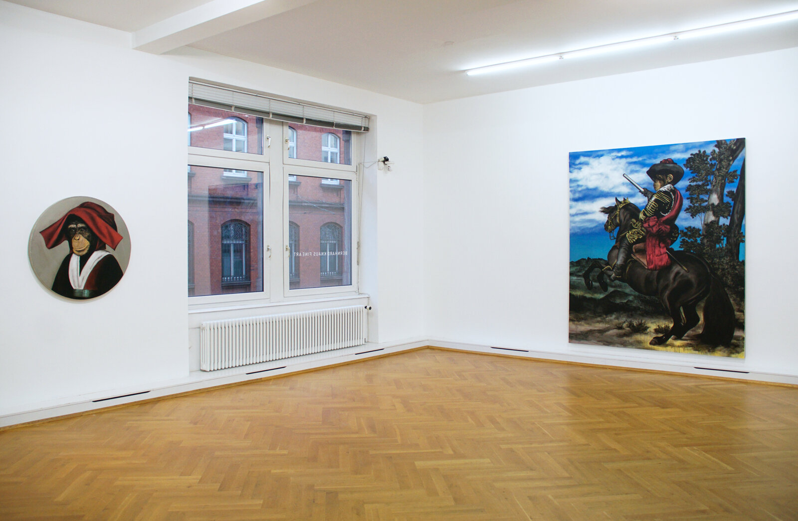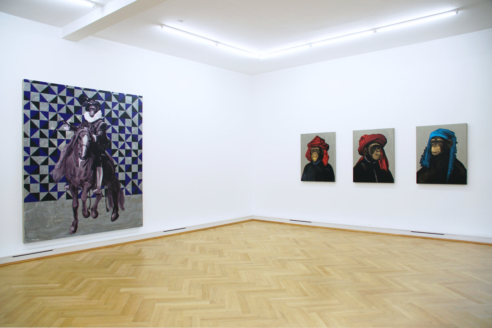 Wie bei meinen Geister-Porträts (2005) und den Original Gurus (2014 – 2017) stelle ich streng genommen, und erkennbar durch Collagen, zunächst Fälschungen her, die dann durch die Umsetzung in Malerei mit ihrem verbürgten Wahrheitsanspruch wieder zu Originalen werden. Bei der Le Singe Peintre-Reihe verwende ich indes als Vorlagen Porträtmalereien von u.a. Frans Hals, Rembrandt, van Eyck oder Bruyn, in denen ich die Köpfe und Hände mit jenen eines Primaten vertausche. Es ist ein ähnliches Spiel, wie es mein Landsmann Rémy Zaugg auf konzeptuell abstrakter Ebene mit seiner Le Singe Peintre-Serie (1981) getrieben hatte, indem er gleichsam nicht das Bild, sondern vielmehr die Idee des Singe Peintre variierte und sich darin als Regisseur, Affe, Schauspieler und Autor in einer Person zusammenfügte.